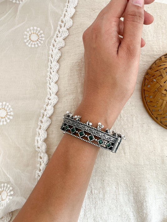 Adhika - Silver Oxidised Teal Green Stone And Moti Kada