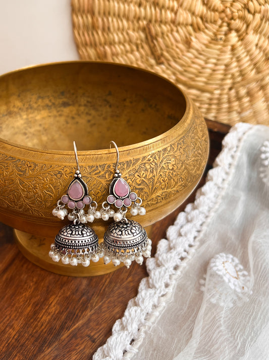 ROZANA- German Silver Studded Jhumka- Baby Pink
