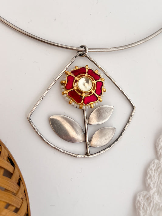MOUSAMI - German Silver Hasli With Kundan Flower Plant Pendant