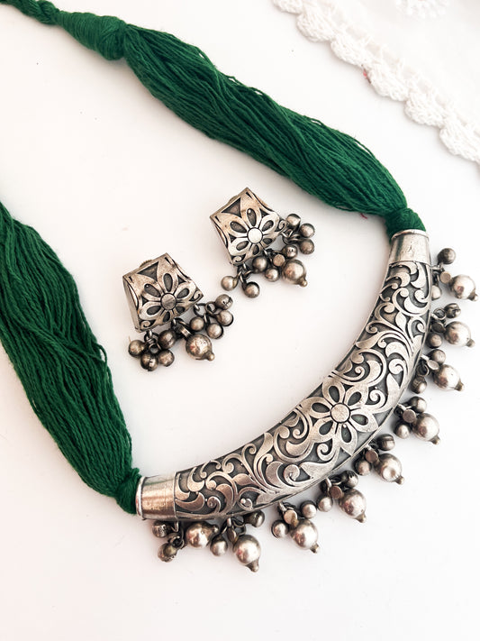 AHANA - German Silver Ghongroo Statement Locket With Green Dhaga