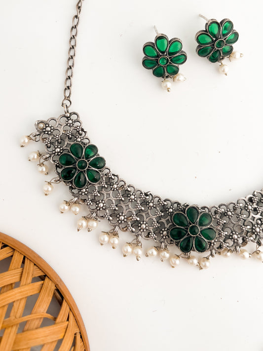 CHARVI- German Silver Necklace Set with Stone Flower - Green