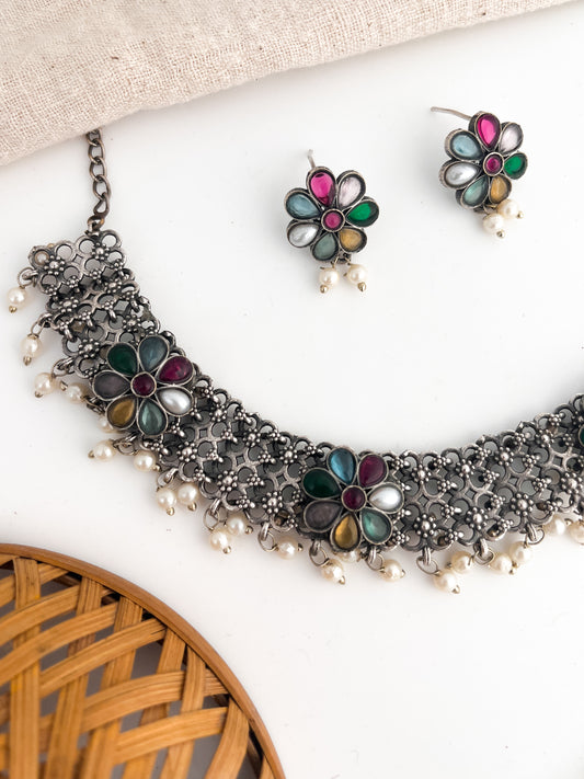 CHARVI- German Silver Necklace Set with Stone Flower - Multi Stone