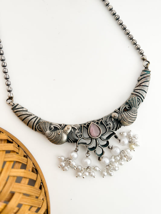 Nayantara - Silver Oxidised Bird Long Neckpiece Pink