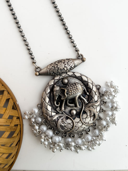 Yashoda - Silver Oxidised Elephant Long Neck piece