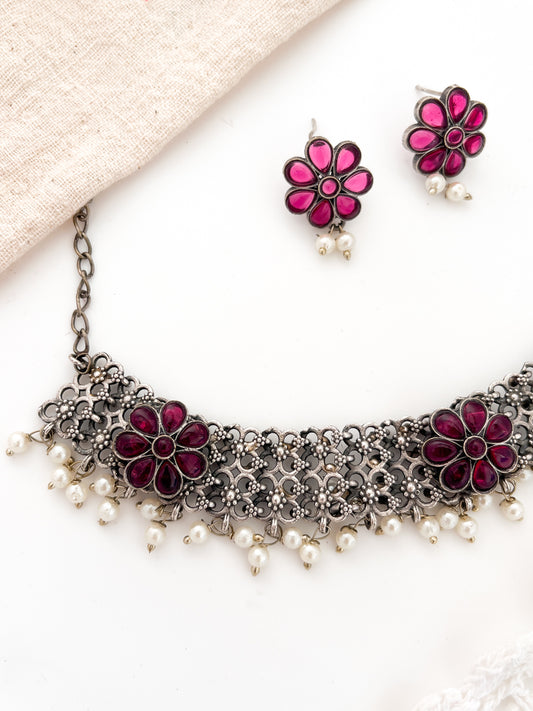 CHARVI- German Silver Necklace Set with Stone Flower - Pink