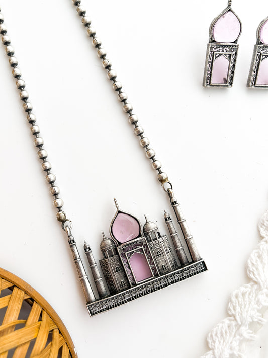 Mumtaz - Silver Oxidized Pink Stone Taj ong Neckpiece