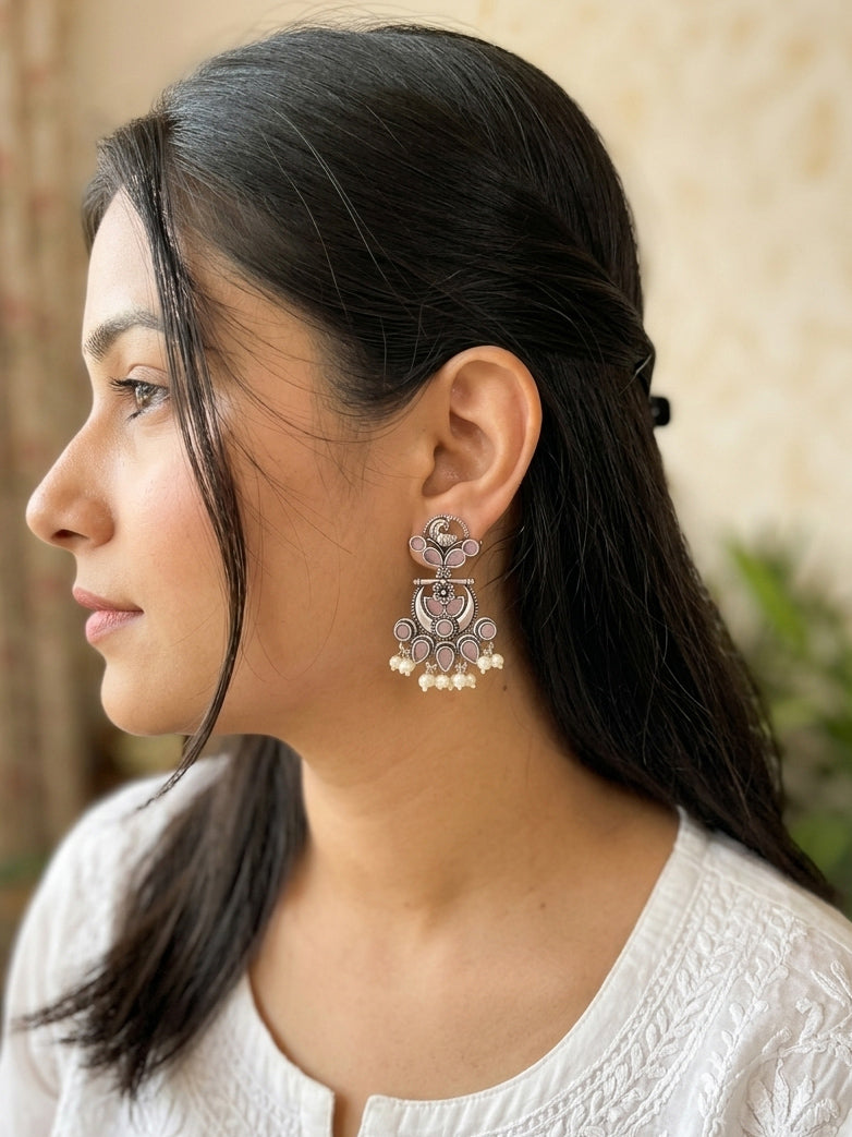 PIHU - German Silver Baby Pink Green Stone Earrings